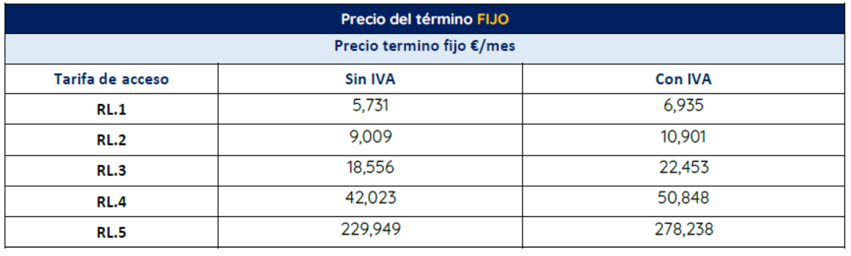 TF: Término fijo (€/mes). Para los grupos de peaje RL.1, RL.2, RL.3, RL.4 y RLTB.5.