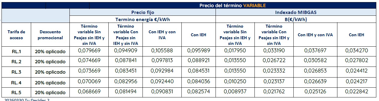 El precio del término variable que se detalla considera el valor de los peajes y cánones por el acceso de terceros a las instalaciones gasistas vigentes.