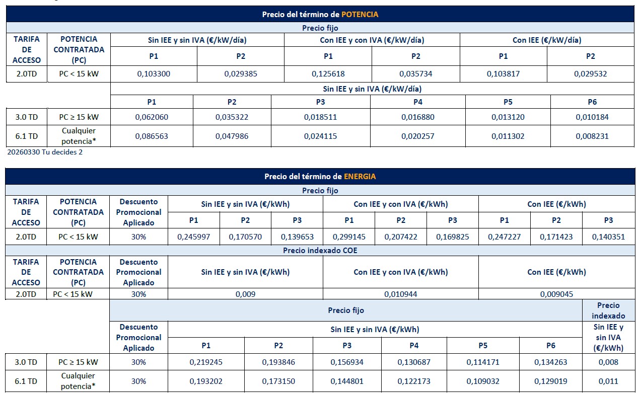 Condiciones económicas para un suministro de 12 meses de duración. Las tarifas 3.0TD y 6.1TD no están dirigidas a consumidores y usuarios (RDL 1/2007). Todos los conceptos recogidos en la Oferta relativos al Término de Energía de los Puntos de Suministros situados en alguno de los Sistema Eléctricos Insulares y Extra peninsulares (SEIES), serán los que correspondan de acuerdo a los Anexos I y XI del RD 738/2015, de 31 de julio, por el que se regula la actividad de producción de energía eléctrica y el procedimiento de despacho en los sistemas eléctricos de los territorios no peninsulares y demás regulación vigente.