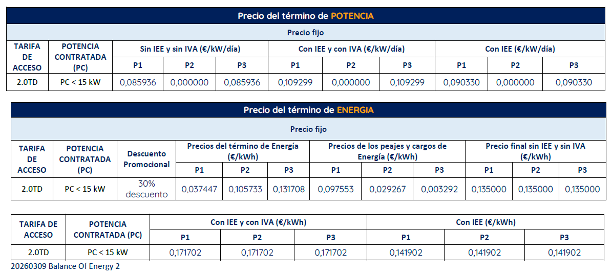 En los productos de tipología indexada no existirá penalización por resolución anticipada de contrato. Los precios que incluyen impuestos:Según RD-L 7/2026. Desde 21/03/2026 hasta el 30/06/2026. El impuesto de electricidad (IE) de 0,5%, o el importe mínimo de 0,5 €/MWh para uso industrial o de 1 €/MWh para resto, según corresponda. Al importe resultante de lo anterior se aplica IVA de 21%, salvo para potencias inferiores a 10kW en Península y Baleares, que se aplicará en factura IVA reducido de 10%. En Canarias se aplica el IGIC (0%, 3% o 7%), y para Ceuta y Melilla aplica el IPSI (1% o 4%), según corresponda. Si en abril´26 la variación del IPC de la electricidad no supera en más de un 15 por ciento el IPC del mismo mes del año anterior, según datos del INE, la reducción del tipo dejará de aplicarse en el mes de junio, y se aplicará IE de 5,1126%, e IVA de 21%.En los productos de tipología indexada no existirá penalización por resolución anticipada de contrato.